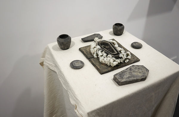 「製作木乃伊需要先將遺體挖去內臟,在腹腔填以乳香、桂皮等香料,縫合後以乾燥泡鹼覆蓋遺體,經35天取出,再裹上麻布,填以香料,塗上樹脂,就做成了木乃伊」 我通過反復用花泥疊層覆蓋它並試圖保持形狀來凍結枯萎的花, 最後在窯裡高溫燒製脫水。 裡面什麼都沒有了,我還保持著她漂亮的外表,就像一個古老的木乃伊化過程。 時間正在暫停,我以鮮花葬她 ,我想紀念她短暫的一生,更以生花陪葬這個枯乾的花。 不知怎的,她現在變了,但我還是不明白永生的意義。